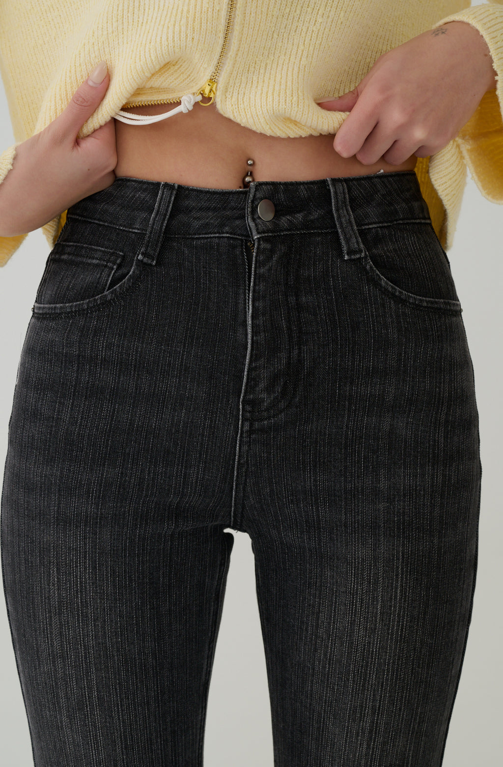 - 如遇高腰設計拉不上拉鍊等現象,只需平放多拉幾次得以成功拉起。高腰版型:肚臍以上三公分處圍一圈。