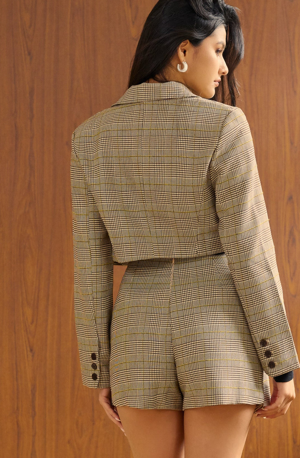 商品細節:高腰、褲裙設計、皮帶扣飾、假口袋設計。
